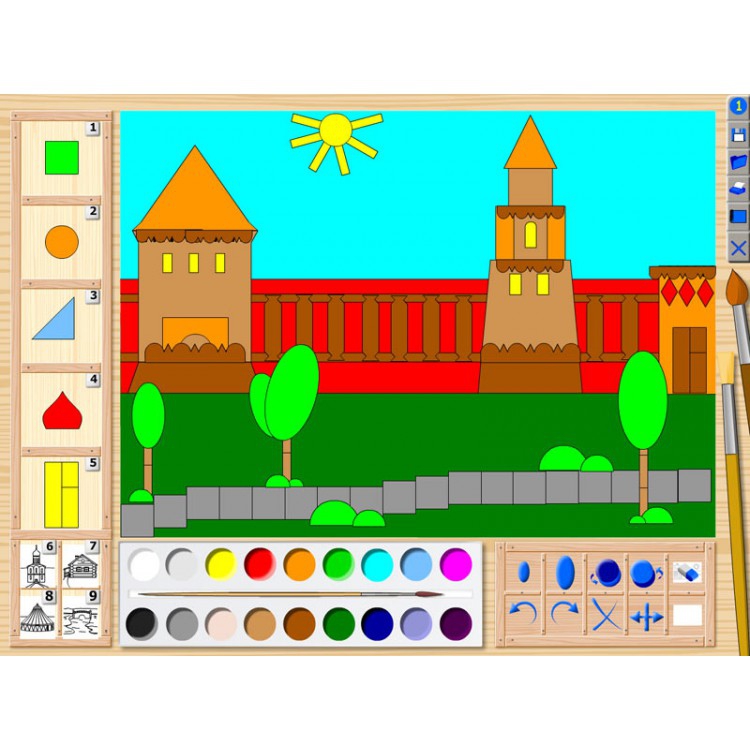 - На занятиях в группе (в классе) в качестве демонстрационного пособия. Демонстрация может быть осуществлена с компьютера через мультимедийный проектор на экран или телевизор с большой диагональю. Педагог (воспитатель) проводит объяснение, беседу, рассказ с опорой на содержание программы. Материалом для демонстрации могут служить заготовки из «Коллекции примеров», а также иллюстрации, заранее созданные педагогом в программе.