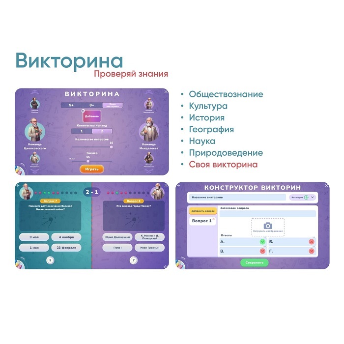 2. Викторина. В блоке «Викторина» дети смогут проверить свои знания о России в разных категориях: обществознание, культура, история, география, наука, природоведение. Для дошколят есть простой уровень с вопросами в картинках, а школьникам предлагается посоревноваться в прохождении викторины на время в командах. Это стимулирует интерес к изучению и помогает закрепить полученные знания.
