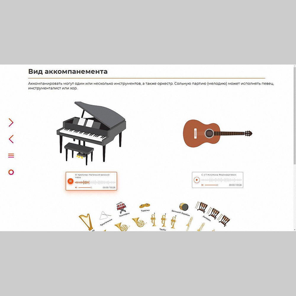 • обучающий материал (тексты, ноты, иллюстрации, аудио- и видеофрагменты);
