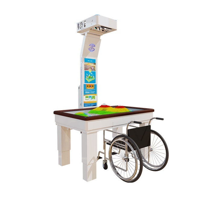 Ее отличительная особенность заключается в том, что она адаптирована для детей и взрослых с нарушениями опорно-двигательного аппарата, ДЦП и нарушениями психоэмоционального развития. Высота игрового поля регулируется при помощи пульта управления на стойке проектора. Песочница снабжена двухуровневой системой защиты при регулировании высоты и мягкими бортиками для дополнительного комфорта и защиты от травм.