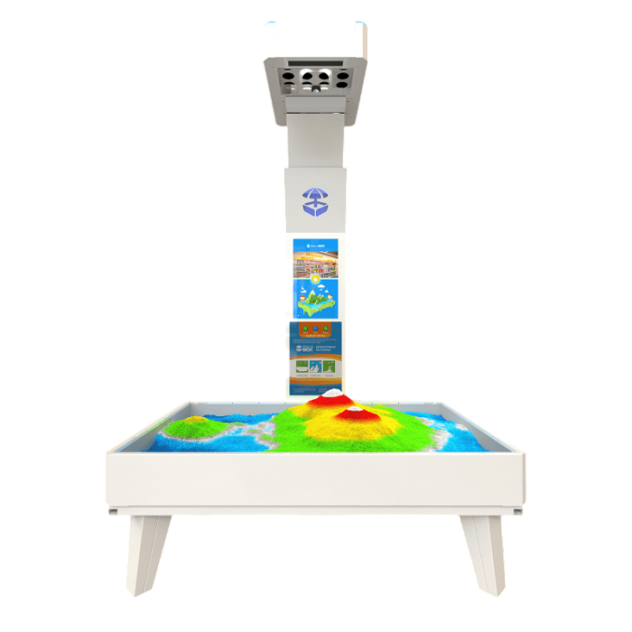 Датчик определяет глубину песка, а программа разбивает полученный рельеф на несколько участков и подает сигнал проектору, каким цветом подсвечивать конкретный участок. Высоты окрашиваются в темные цвета, долины и пологие склоны - в зеленые, а низменности - в голубые. Таким образом, в ящике с песком создается рельеф земной поверхности с горными хребтами, лугами и водоемами, который можно менять в режиме реального времени. На песок падает не просто цвет, а проецируются живые текстуры равнин, гор, воды, лавы, поверхностей планет и т.д. В песочнице сменяют друг друга времена года, внезапно нападают сказочные драконы, в глубинах океана скрываются диковинные рыбы, а, когда нужно немного порезвиться, вдруг появляются праздничные воздушные шары. Программа способна распознавать жесты рук. Таким образом, игрок может управлять многими объектами, которые отображаются на песке.