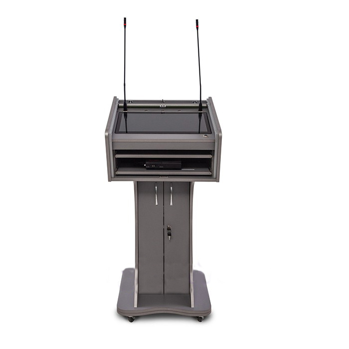 Вы можете не беспокоится о сохранности экрана при транспортировке трибуны – он защищен антивандальным стеклом. Корпус кафедры мы выполнили из ударопрочного пластика, что делает интерактивный многофункциональный подиум визуально привлекательным. Мультимедийная трибуна оснащена всем необходимым функционалом для презентации и выступлений.