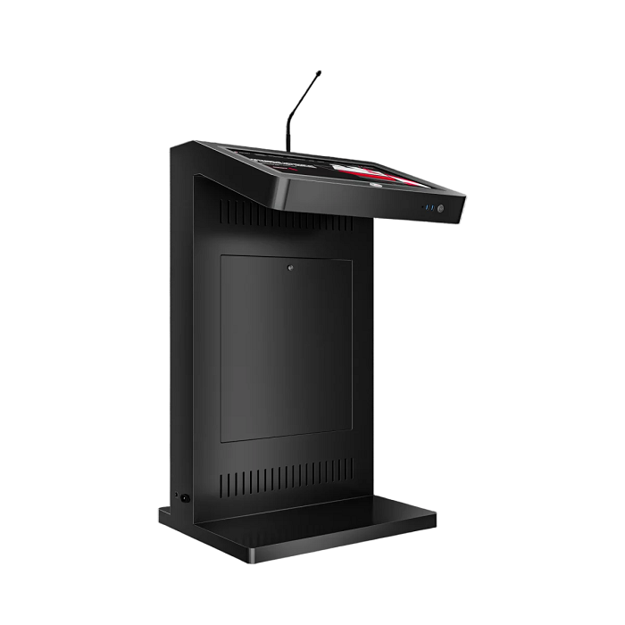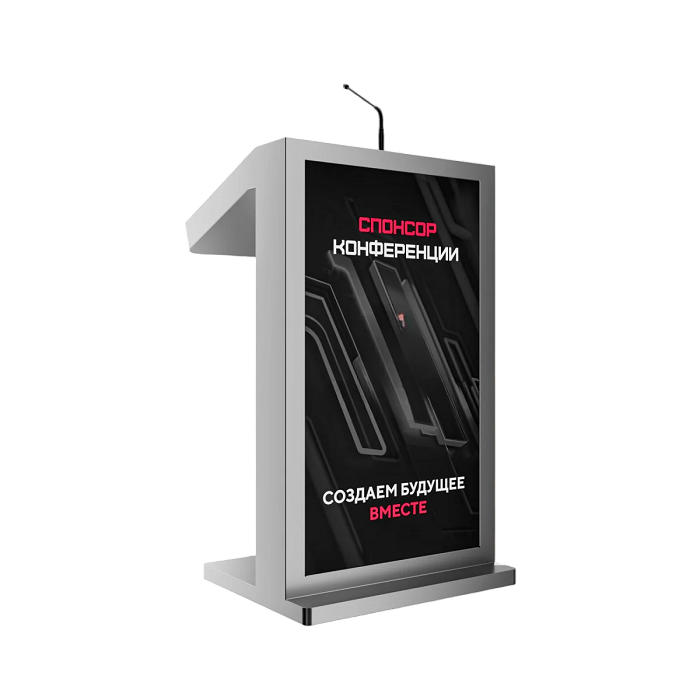 Мультимедийное решение, которое позволяет не только ярко выступить на большую аудиторию, с отображением презентационного материала, но и эффектно продемонстрировать рекламную информацию о компании, предлагаемых товарах / услугах, спикере, на большом внешнем дисплее трибуны. Модель Double 19" оснащена мощным микрофоном, сенсорным дисплеем для спикера, а также большим внешним дисплеем для рекламного контента и набором разъемов для подключения дополнительной техники. Такая трибуна станет прекрасным помощником на конференциях, выставках, спортивных мероприятиях или других мероприятиях, где требуется визуальная поддержка презентаций и общение с аудиторией.