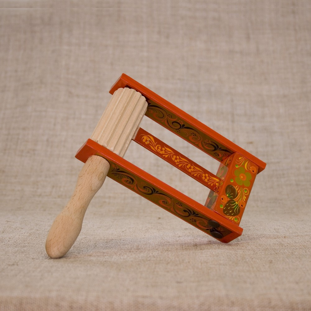 Представляет собой зубчатый барабан, совмещенный с ручкой. На зубчатом барабане вверху и внизу крепятся пластины, соединенные прямоугольной бобышкой. В бобышку вклеена деревянная пластина, которая упирается в барабан. При вращении барабана пластина перескакивает по зубцам и издает громкие щелчки. Вращение может осуществляться в любую сторону.
