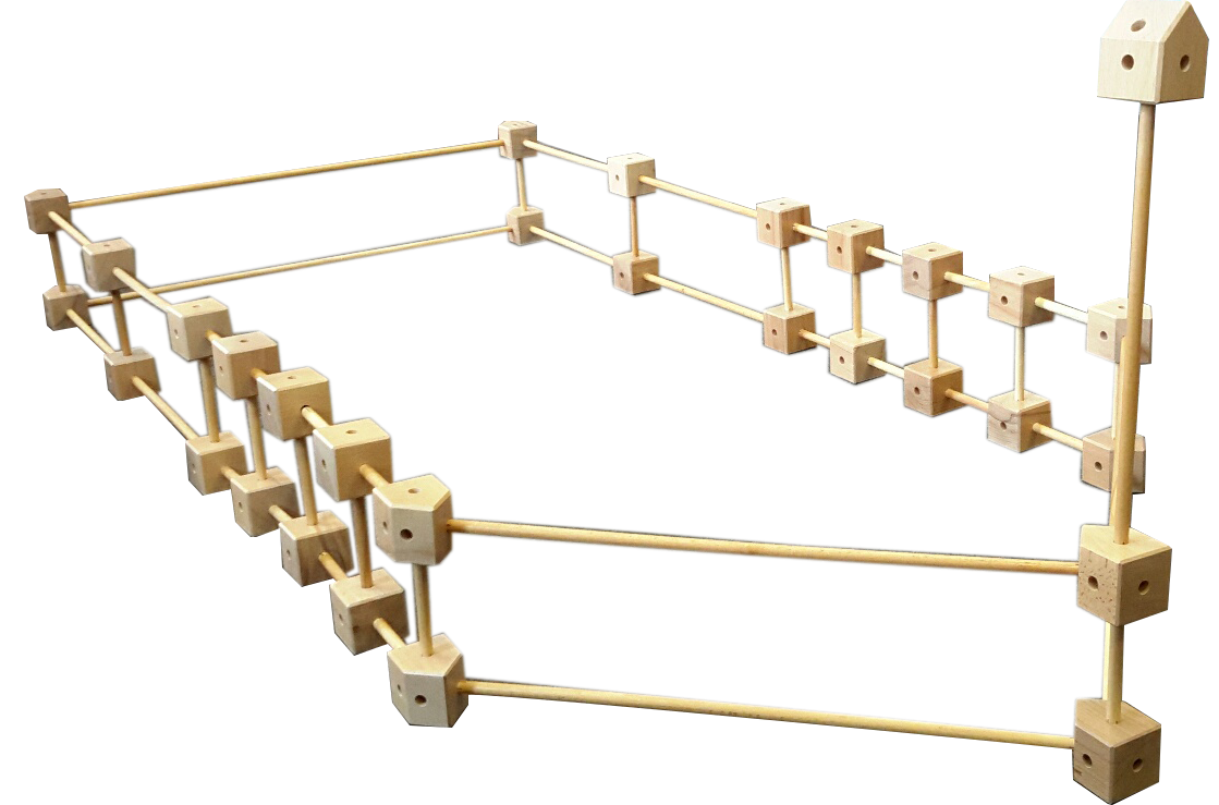 Состоит из реек трех вариантов длинны и соединительных элементов. Даже из такого небольшого количества элементов можно легко и быстро построить дом, корабль, самолет и другие конструкции для развертывания сюжетной игры, собрать полосу препятствий или целый лабиринт, ширму для театральной деятельности или уголка уединения.
