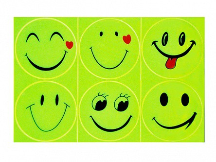 Световозвращающие наклейки представляют собой плоские фигурки в форме круга с рисунком в виде улыбки и световозвращающим покрытием желтого цвета, которые можно клеить на одежду, сумки и другие предметы. Наклейки размещены на листе формата А5.