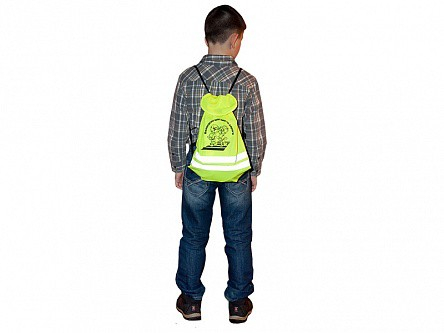 Световозвращающий рюкзак представляет собой мягкий заплечный мешок желтого цвета с двумя световозвращающими полосками, по бокам которого находятся две лямки, наверху – текстильная застежка, внизу – вставки из кожзаменителя с люверсами, а спереди нанесен рисунок и слоган.