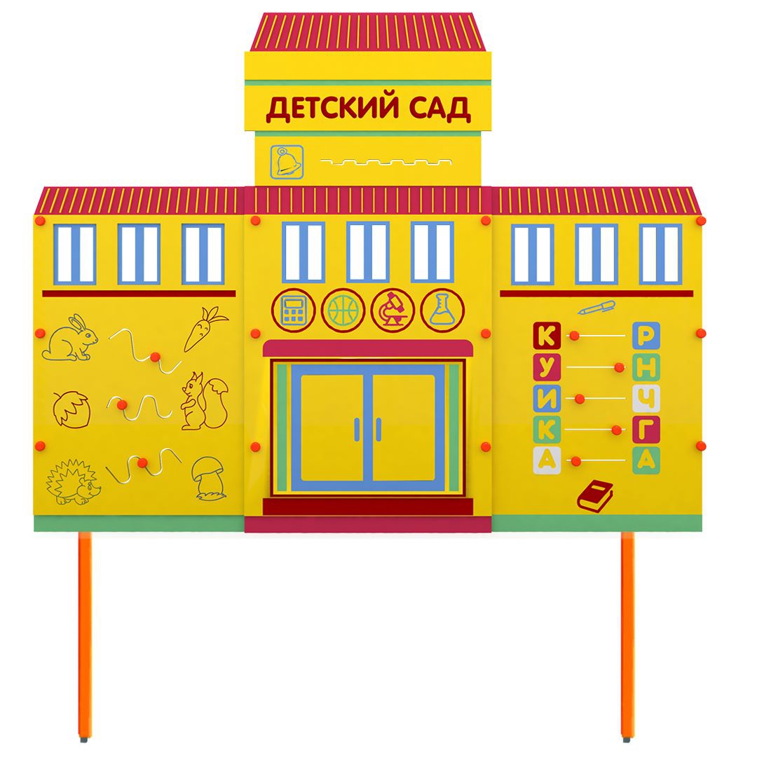 Стационарный макет детского сада дополняет комплект автогородка, позволяет создавать различные дорожные ситуации! Используйте стенд как точку назначения или старта движения в ролевых играх по изучению правил дорожного движения. На макете расположены бизи-элементы, которые ребенок может крутить, перемещать, тем самым развивая моторику рук. Макет предназначен как для помещения, так и для улицы. Макету не страшны никакие осадки, ведь он выполнен из влагостойкой фанеры! Монтаж простой и не требует специальных навыков.