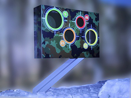 Тренажер по метанию ручных гранат представляет собой вертикально установленную прямоугольную конструкцию с 4 круглыми отверстиями в форме мишени, имеющими разный диаметр, числовое значение которого будет являться количеством баллов в случае попадания муляжом ручной гранаты в мишень. После попадания внутрь короба муляж гранаты скатывается по наклонному стержню и падает в руки юному пехотинцу.