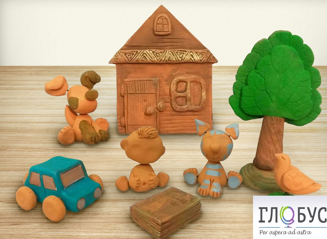 В набор входят восемь фигурок: малыш, дом, дерево, книга, собака, кошка, птичка, машина. Материал: глина.