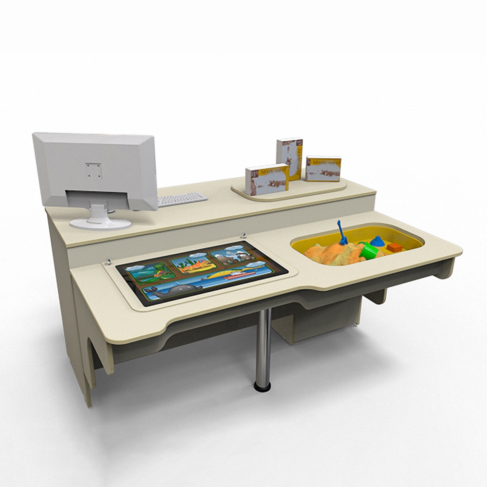 Конструкция стола предусматривает наличие двух оборудованных рабочих мест для педагога и ученика. На месте учителя установлен компьютер (ЦП- Intel Core i3-2.13 Ghz, ОЗУ – 4 Gb DDR4-1600, SSD-120Gb) с 22 дюймовым монитором. На месте ученика вмонтирован планшет с большим 25 дюймовым сенсорным экраном, поддерживающим до 10 одновременных касаний.  Также присутствует два микрофона и встраиваемый отсек для творчества (с кинетическим материалом) – он помогает работать над мелкой моторикой ребенка.
