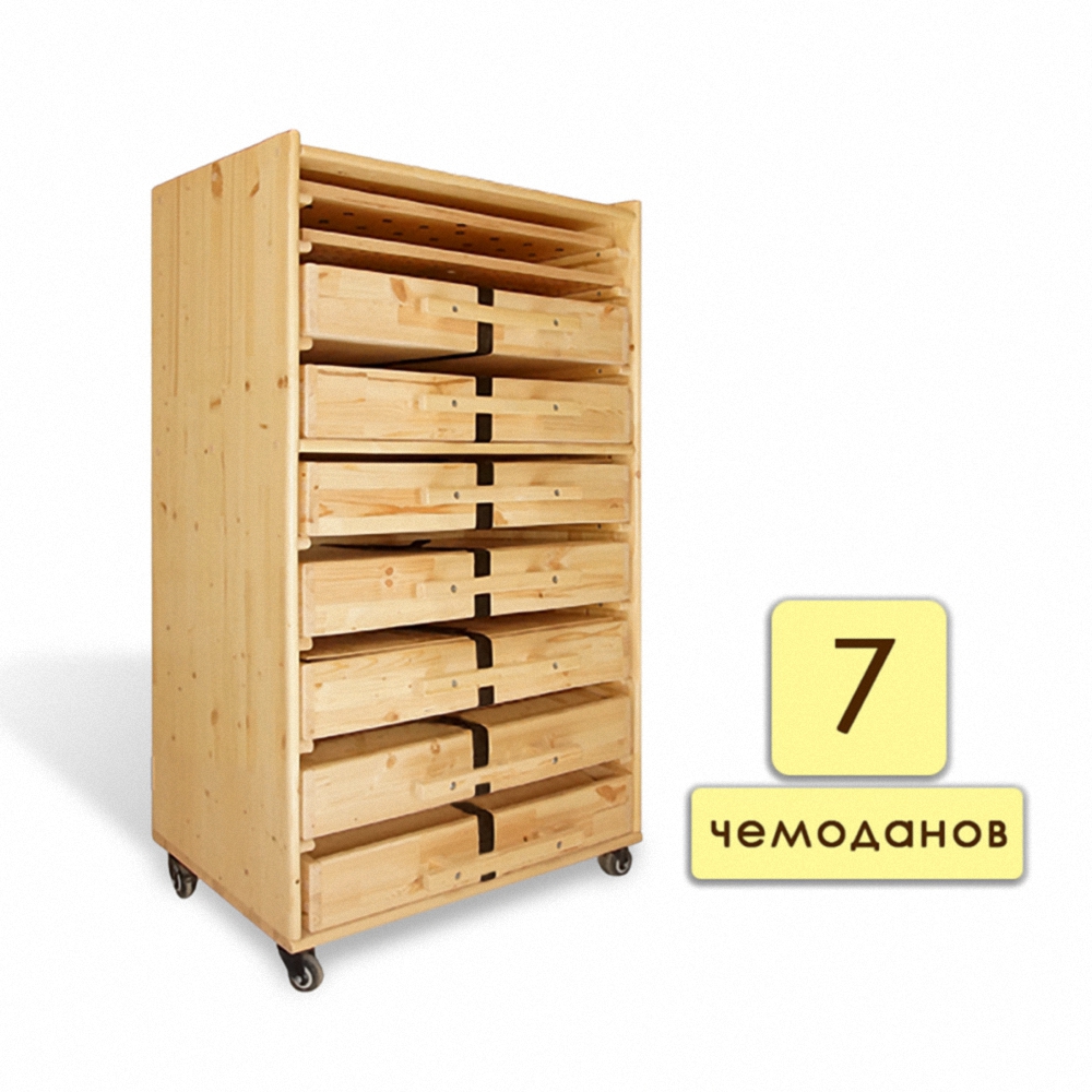 Все эти компоненты удобно расположены внутри деревянного стеллажа на колесиках. Вы можете легко перемещать сразу весь набор в любое место. Ящики и доски достаются легко благодаря удобным ручкам.