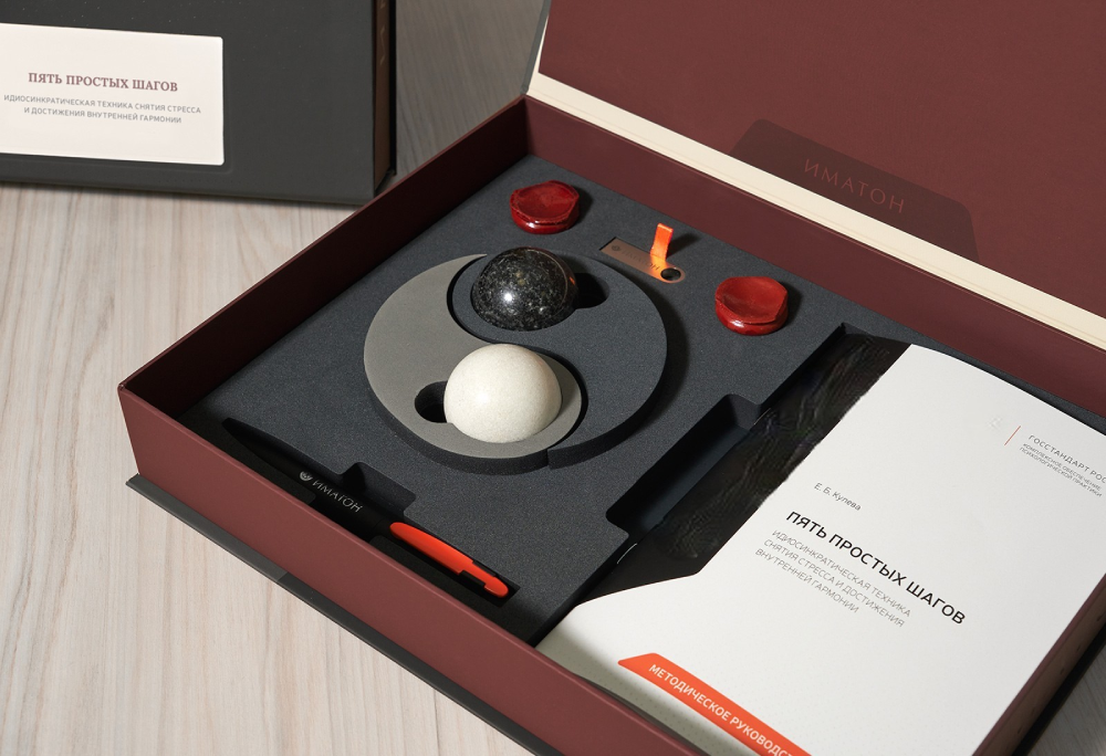 Структура каждого из них состоит из: текста ввода, текста внушения, текста вывода из состояния релаксации. Цикл прослушиваний состоит из 12 -14 сеансов. Во время сеанса релаксации реальные соматические симптомы становятся слабее, активируются ресурсы организма. Методика включает в себя также методы для экстренной саморегуляции в стрессовых ситуациях. Одним из таких способов является поглаживание гладких и продолговатых поверхностей. Прикосновение к сферическим формам обладает дополнительным успокаивающим воздействием. Черный и белый каменные шары, входящие в комплектацию методики, способствуют уравновешиванию эмоциональ - ного фона в процессе сеанса, прикосновение к сферическим формам обладает мощным успокаивающим воздействием. Известный психологам уже более века закон Уильяма Джемса гласит: «Все неизменное исчезает из сознания». Медленное монотонное перебирание шаров, концентрация на движениях кисти, отчетливых тактильных, кинестетических, температурных ощущениях не только приводят к расслаблению и успокоению, но и создают ситуацию, в которой сознание, лишенное новых стимулов из внешней среды, неизбежно обращается на самого человека — его переживания, визуальные образы, телесные ощущения. Таким образом достигается готовность к медитации. Аналогичные эффекты можно наблюдать при гипнозе, а также в условиях сенсорной депривации.