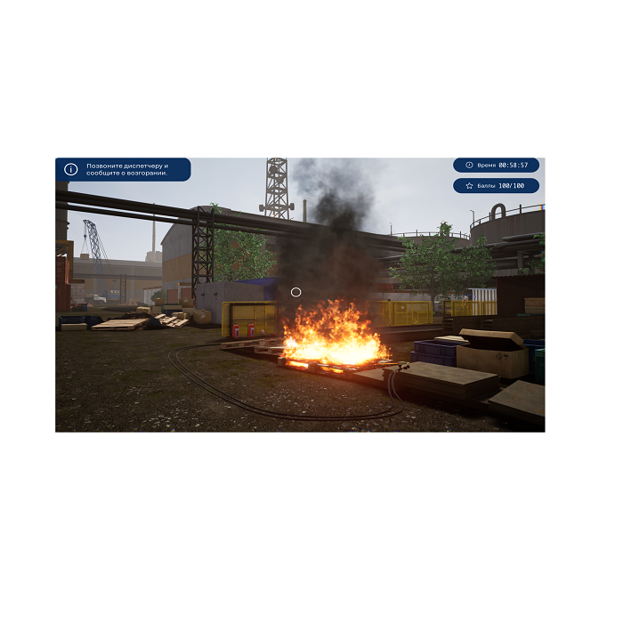 Тренажер «Пожарная безопасность на предприятии» воссоздает ситуацию, в которой пользователь должен определить очаг возгорания, оценить ситуацию в зависимости от типа площадки (административное помещение, стройплощадка, цех) и действовать согласно регламентам по технике пожарной безопасности.