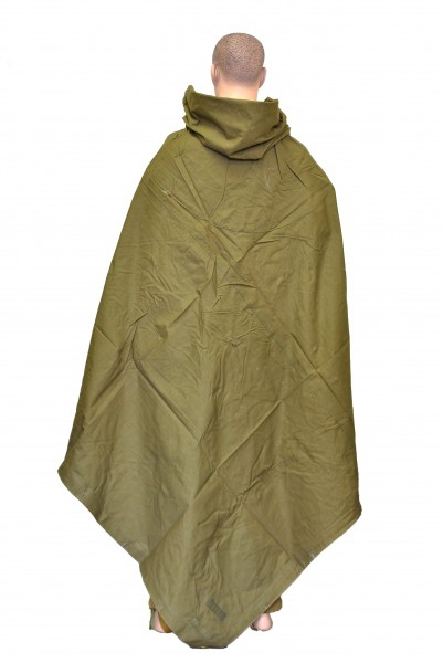 Солдатская плащ-палатка, применяемая в современных вооруженных силах, предназначена для защиты тела и одежды от атмосферных осадков и оперативной организации временного укрытия. Ткань оливкового цвета, с водоотталкивающей пропиткой представляет собой широкое полотно с системой шпеньков и колец. Имеет небольшие габариты в сложенном состоянии и умещается в любой рюкзак или походную сумку. При появлении дождевых или снежных осадков накидывается на тело поверх обмундирования и одежды, и, с помощью шпеньков быстро фиксируется на теле. Имеется большой капюшон на стяжке, позволяющий одевать его поверх защитного шлема. При наличии сильного и холодного ветра эффективно защищает от «продувания» основной одежды прилегающей к телу, способствуя сохранению тепла. Другое предназначение плащ-палатки – использование в качестве временного укрытия.