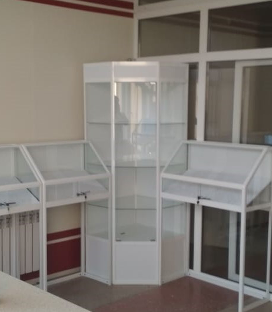 Стенд-витрина выполнен из алюминиевого профиля, полки из минерального стекла -5 мм, дверцы и боковые стенки из минерального стекла -4 мм, с бронированием пленкой 112 мкм.