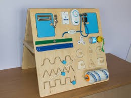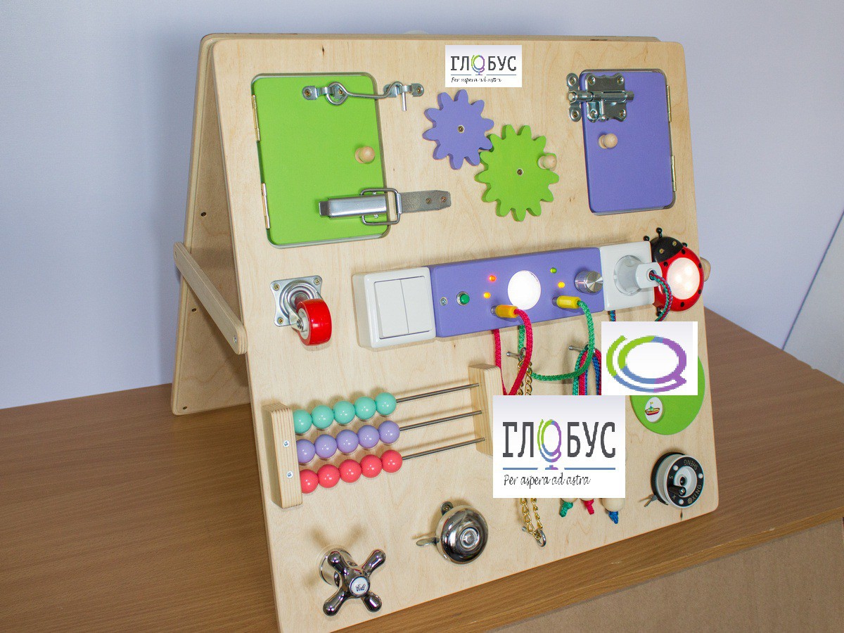 Напольный двухсторонний бизиборд домиком представляет собой устойчивую конструкцию.