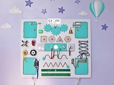 - Электрическая панель: светильник в центре, кнопочка-пищалка, диммер освещения для светильника с функцией выключения (вращающаяся ручка), двухклавишный выключатель зажигает пару светодиодов. Другие два загораются при вставленных штекерах. Розетка выполняет функцию подачи питания от батареек ко всей панели. Батарейки сменные.