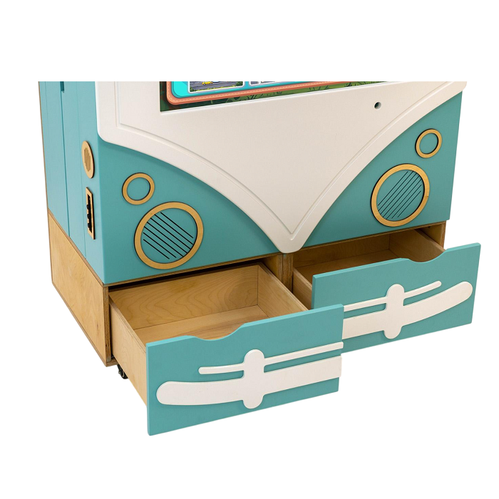 В нижней части панели-автобуса предусмотрены два выдвижных ящика для хранения игрушек и методических материалов. Весь интерактивный комплекс имеет колёсики со стопорами, чтобы его легко можно было передвинуть в любое место.