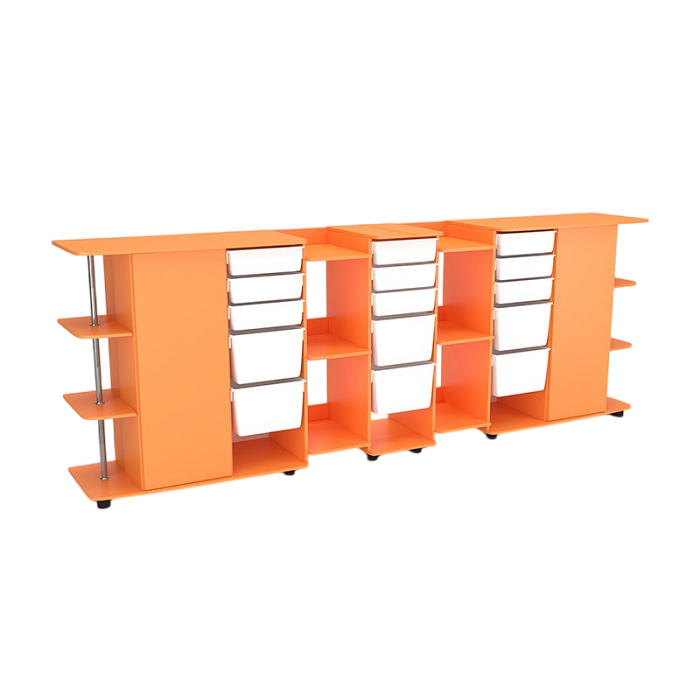 Стеллажи для помещений и классов начальной школы или детского сада. Игрушки, книги и конструкторы удобно хранить на множестве открытых полок (10 полок), размер полки - 315х350 и 384х316 мм и в открытых съёмных контейнерах RoxBox.