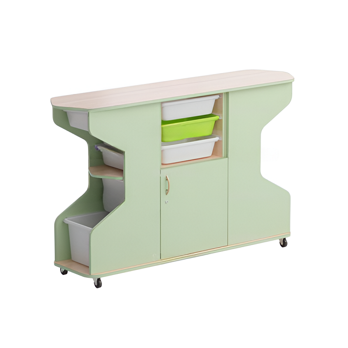 В средней части боковых секций закреплена фигурная полка, которая служит упором для столов на колёсиках: правого и левого.