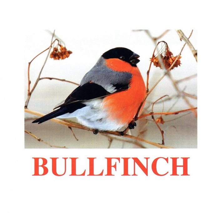 Перевод (на карточках перевод не указывается):  Орёл, пеликан, фламинго, утка, журавль, ара, лебедь, колибри, синица, павлин, чайка, сова, кардинал, воробей, голубь, снегирь, скворец, грач, аист, клёст.