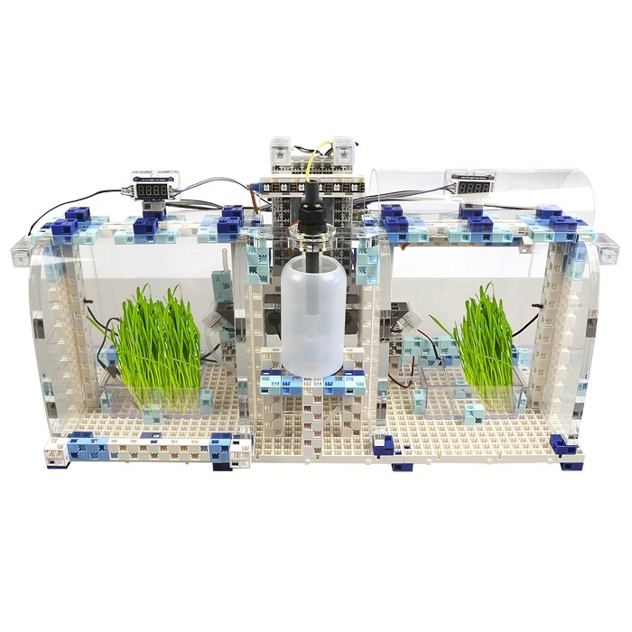 В собранном виде набор представляет собой настольную модель теплицы с двумя внутренними отсеками, на внешней стороне которых монтируется микрокомпьютер, контролирующий параметры модели и управляющий исполнительными механизмами, а также датчики и оборудование, согласующее разные узлы системы. Каждый отсек оборудован датчиками света, температуры и влажности почвы.