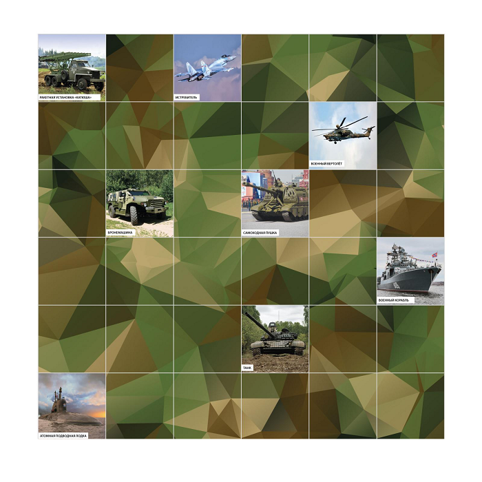 На поверхности коврика представлены яркие и красочные изображения различных видов военной техники, включая танки, боевые самолёты, вертолёты и военно-морские суда. Этот коврик станет отличным помощником в изучении разнообразия военной техники и формирования патриотических чувств. Он побудит детей осознать достижения своей страны и уважать военное наследие. Кроме того, коврик способствует расширению словарного запаса, так как каждый элемент на коврике может быть использован для изучения новых терминов и понятий, связанных с историей, технологиями и военным делом.