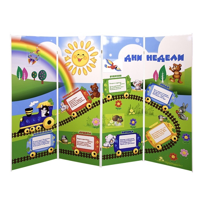 Дидактическая ширма представляет собой складную переносную перегородку, состоящую из четырех секций. Каждая сторона секций представляет собой полноцветное дидактическое панно с интегрированными рельефно-визуализационными элементами. На панно представлены дни недели.