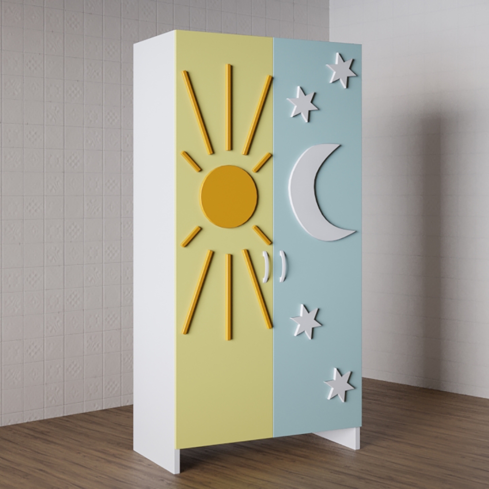 Шкаф «День Ночь»  — необычный элемент интерьера детской комнаты, который подходит для мальчиков и девочек разных возрастов. Данная модель шкафа выполнена из качественных, а главное безопасных материалов, что позволяет детям раннего возраста самостоятельно складывать вещи, без помощи взрослых. Дверцы шкафа легко открываются и закрываются, а глубокие, вместительные полки для одежды, а также иных вещей и даже игрушек, позволяют держать все в поле зрения ребенка. Необычный дизайн шкафа привлекает внимание детей, что стимулирует к поддержанию порядка и занятиям малышей разного возраста.