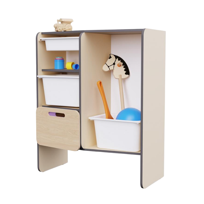 Модуль дополнительно оснащён ящиком полного выдвижения, что упрощает доступ к инвентарю. Снизу предусмотрено место для выдвижной скамейки. Шкаф изготовлен из экологичной берёзовой фанеры с безопасными скруглёнными краями. Три пластиковых контейнера полностью вынимаются и дезинфицируются.