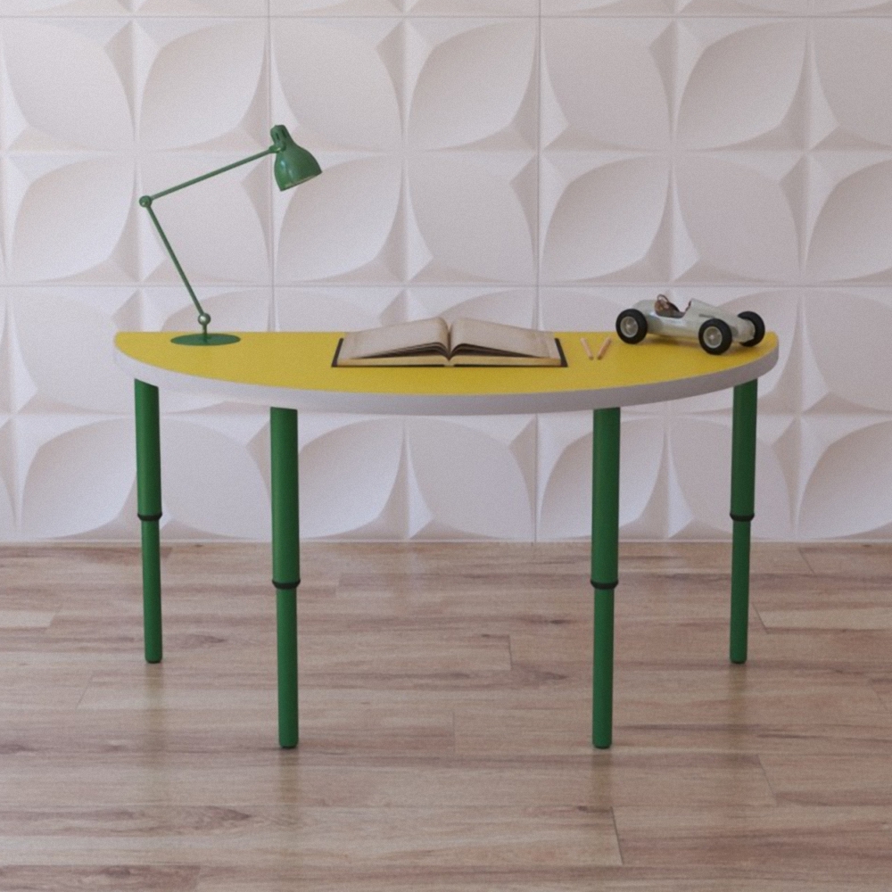Двухместный стол “Половинка” состоит из полукруглой столешницы и четырёх телескопических ножек, благодаря им его можно отрегулировать на нужную высоту. Стол нужен для оснащения учебными местами начальных классов в школах, групп в ДОУ, коррекционных и развивающих центрах. Станет незаменимым предметом мебели для детей; за ним могут с комфортом разместиться 1-2 ребёнка.