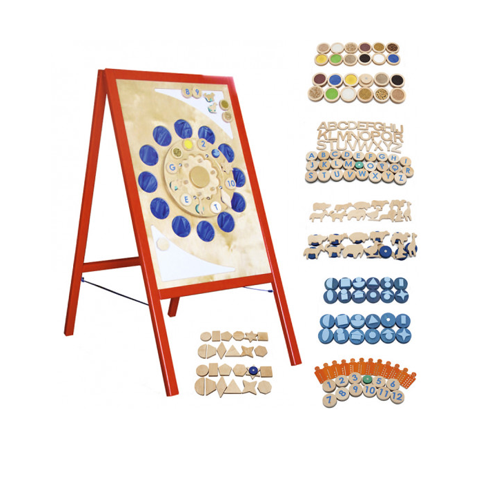 Задача игры: магнитные фишки нужно разместить на магниты рулетки, которая находятся в центре мольберта, немагнитные фишки нужно разложить в мешочки – «норки». На ощупь игрок должен найти пару к каждой магнитной фишке. С помощью рулетки с металлическим шариком внутри, которую раскручивает игрок, определяется фишка, к которой нужно на ощупь найти пару. Возможно много вариантов игры.