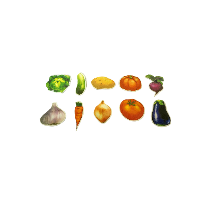 Благодаря данному набору ваш ребенок узнает названия овощей, цветов, размеров. Также данный набор будет верным помощником в освоении счета.