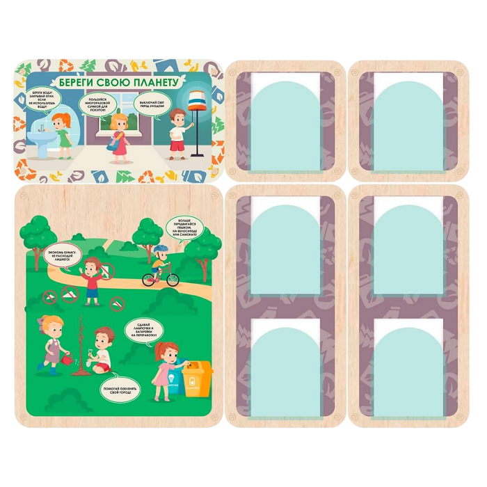 Информационный стенд для оформления стен в детских садах, начальной школе и организациях дополнительного образования. Красочные наглядные иллюстрации с простыми подписями помогут дошколятам понять правила экологичного поведения, даже если они ещё не умеют читать. Важная информация для родителей может размещаться в акриловых карманах около каждого стенда.