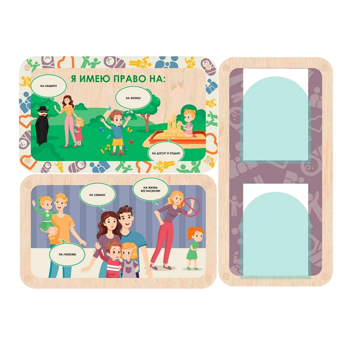 Панели информационных стендов выполнены из экологичной берёзовой фанеры, рисунок нанесён с помощью UF-печати стойкими к выцветанию красками, не имеющими неприятного запаха. Углы панели скруглены, крепления к стене скрыты декоративными заглушками для безопасности ребёнка. Стенды можно очищать сухой и влажной тканью.