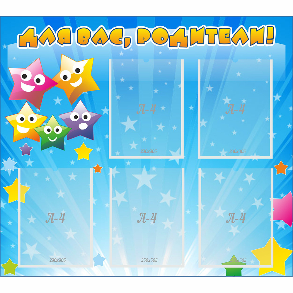 Веселые звездочки станут настоящими друзьями для малышей. Они подарят детям улыбки и хорошее настроение. Главные элементы дизайна – цветные звезды. Родителям будет интересно узнать про расписание занятий в группе, их ежедневной тематике, о режимных моментах и других объявлениях. Стенд привлекая внимание, как взрослых, так и детей, доносит информацию до адресата. К тому же он сделан из качественного и прочного материала, поэтому прослужит долго и надежно. Специальное покрытие защищает краску, его удобно разместить на любой поверхности.