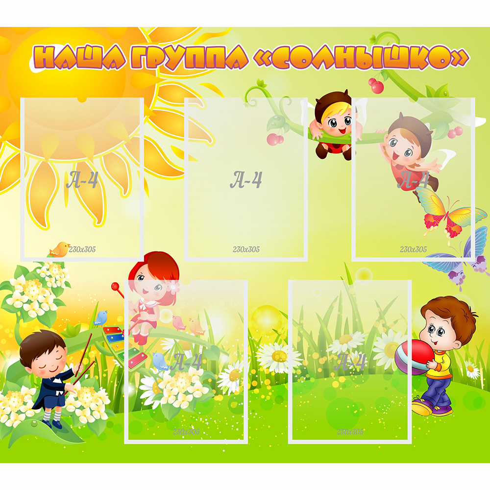 Дизайн этого стенда разработан специально для группы с названием "Солнышко". Основной элемент картины - огромное солнце, заливающее лучами летнюю лужайку, на которой играют дети. В удобных вертикальных карманах можно разместить списки детей, объявления, правила поведения, распорядок дня, контактные данные воспитателей.