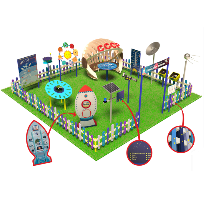 «Детская космическая станция» - это уличный комплекс, в состав которого входят красочные интерактивные стенды и макеты. С их помощью дети осваивают первые азы астрономии.