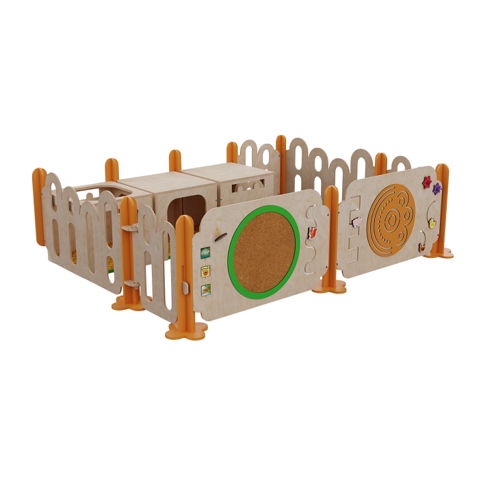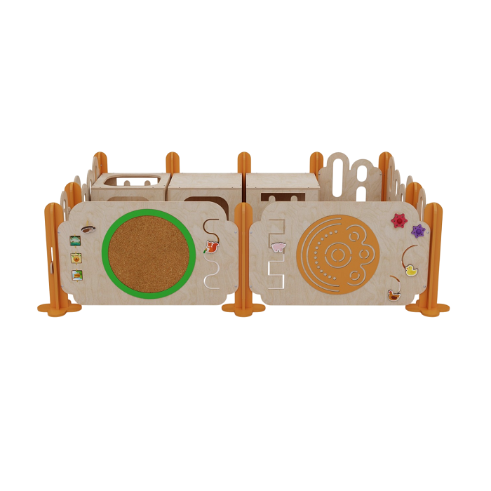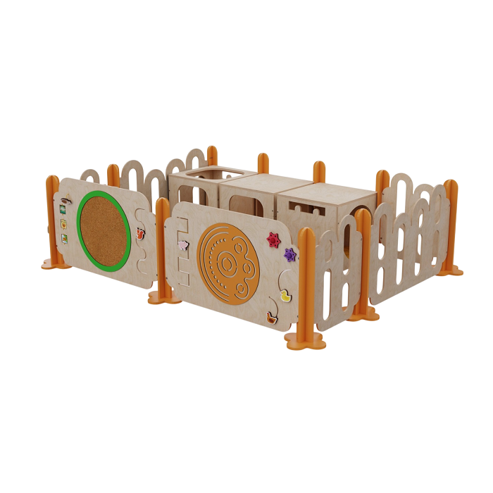 Манеж обеспечивает безопасность малышей, а дополнительные элементы конструкции — кубы и бизиборды — расширяют игровое пространство и способствуют развитию координации, моторики и фантазии.