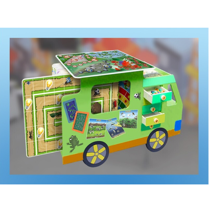 Развивающий детский комплекс "Игруля" представляет собой стилизованный под яркую машинку, игровой комплекс, с удобной ровной поверхностью для настольных игр. В конструкции машинки предусмотрена удобная система хранения игр и специальные ящички их атрибутов, включенных в комплект поставки.
