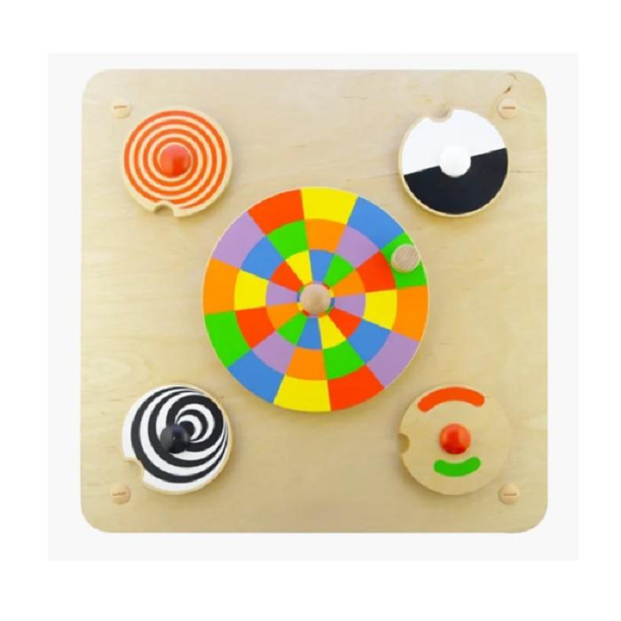 Панель выполнена из березовой фанеры, лицевая часть панели содержит 5 красочных колес. Сенсорная игрушка, используемая для визуальной релаксации, развивает двигательные навыки.  Способствует снятию эмоционального напряжения. Центральное большое цветовое колесо имеет блоки цветов и ветровую ручку. При вращении цвета имеют тенденцию сливаться и смешиваться, создавая новые цвета и узоры. Цветные круги меньшего размера не имеют ручек, но имеют выемки для пальцев, позволяющие детям вращать их, создавая захватывающие визуальные эффекты. Популярно среди детей, которые хотят заняться процессом вращения колесиков в разных направлениях (и очень нравится детям с аутистическим спектром).