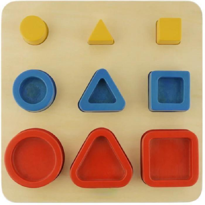 На лицевой стороне панели расположены 3 комплекта составных блоков с выемками в виде геометрических фигур в 3 ярких цветах: красный, желтый и синий. Панель выполнена из березовой фанеры. В процессе игры дети сортируют блоки по цветам, в соответствии с геометрическими формами на панели, строят пирамидки, вставляя подходящий по форме меньший блок в блок большего размера. Очень хорошая игрушка для развития логических навыков.