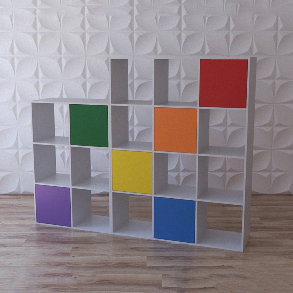 Стеллаж «Яркие акценты» имеет устойчивую массивную конструкцию и предназначен для хранения и расположения большого количества предметов. Изготовлен в простой форме, основание имеет белый цвет, а дверцы закрытых полочек – разноцветные (всего их 6), открытых же полочек – 13. Благодаря стеллажу хранение игрушек и книг станет организованным и займёт намного меньше места. Этот стеллаж станет отличным модулем для оснащения помещений и украсит любое помещение за счёт своего нарядного и воздушного облика. Модуль предусмотрен для группы детсада, яслей, но также будет хорошо смотреться в игровом детском уголке кафе или дома в детской комнате.
