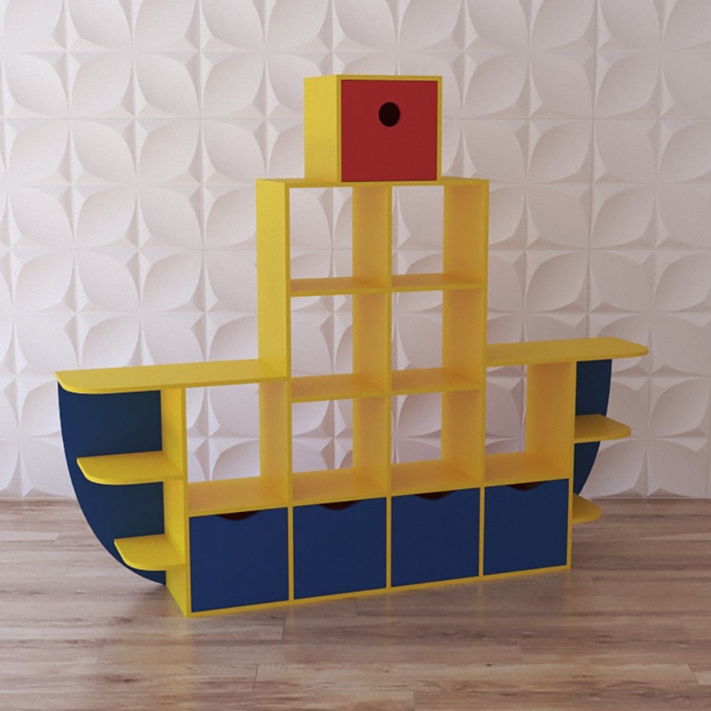 Шкаф-стеллаж представленной модели выполнен в форме корабля, имеет 16 открытых и 5 закрытых полочек, окрашен в желто-синей гамме с одиночным красным акцентом. Благодаря продуманной конструкции стеллажа хранение станет организованным и займёт намного меньше места. Стеллаж для игрушек станет отличным модулем для оснащения помещений и украсит любое помещение за счёт своего яркого и необычного внешнего вида. Этот яркий модуль предусмотрен для группы детсада, яслей, но также будет одинаково хорошо смотреться в игровом детском уголке кафе или дома в детской у малыша.