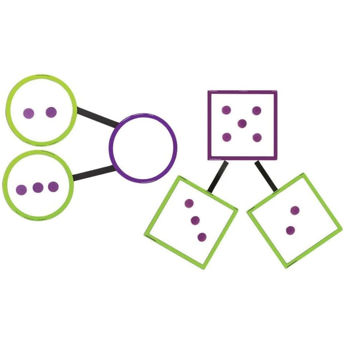 Два набора, в формате круга и квадрата, позволяют многократно продемонстрировать числовые связи. Регулярно меняйте формат и порядок каждый раз, когда вы размещаете числа на доске. Например, вы можете поместить фиолетовый круг (целое) сверху и два зеленых круга снизу (часть/часть), или фиолетовый квадрат слева (целое) и два зеленых квадрата (часть/часть) справа. Также вы можете использовать одновременно круги и квадраты, чтобы показать часть-часть-целое для усиления коммутативного свойства сложения.
