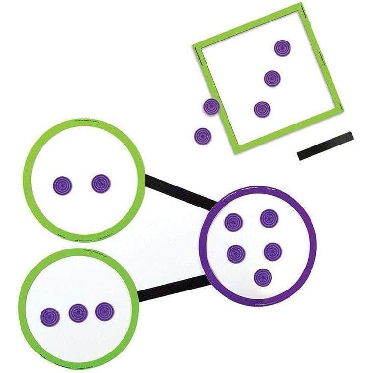 Начните с размещения двух разных магнитных дисков (3 и 2, например) в зеленых кругах или квадратах. Попросите ученика подойти к доске, потрогать и сосчитать каждый диск, а затем поместить сумму (5) в фиолетовый круг или квадрат (или просто напишите число 5). Продолжайте с другими примерами. Выполните те же действия с вычитанием.
