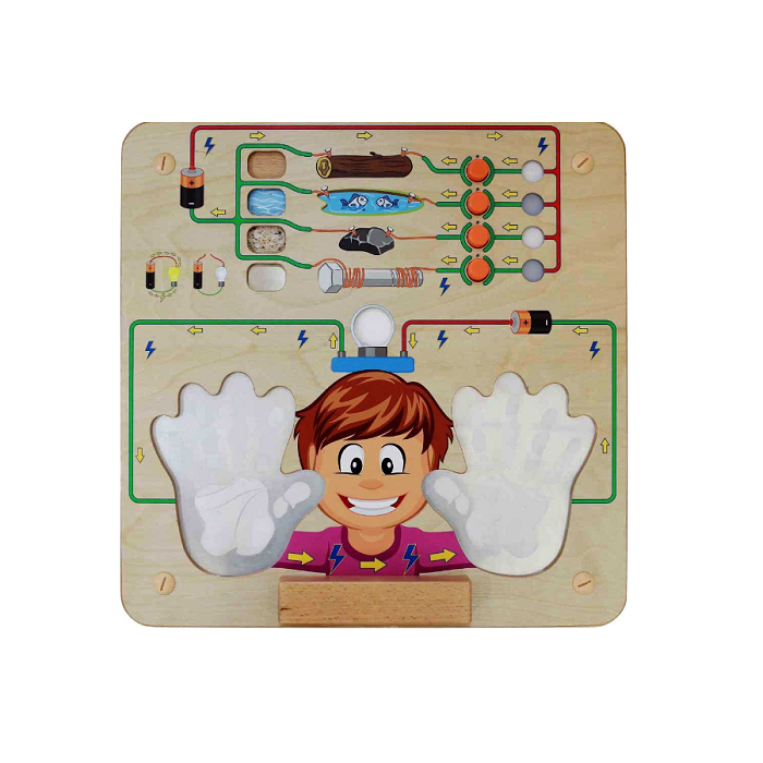 Настенная панель из березовой фанеры, на лицевой части которой присутствуют 2 электрические цепи. Цепь в верхней части панели разомкнута, и детям требуется замкнуть её, нажав одну из 4 кнопок. Каждая кнопка представляет собой разный тип материала различной проводимости. Вторая цепь также является разомкнутой. Детям предложено использовать свои тела в качестве соединителей, чтобы сделать цепь замкнутым контуром. Когда ребенок поместит обе руки на панель, включится свет! Наглядная демонстрация того, что челевеческое тело является электропроводником. Батареи не включены.