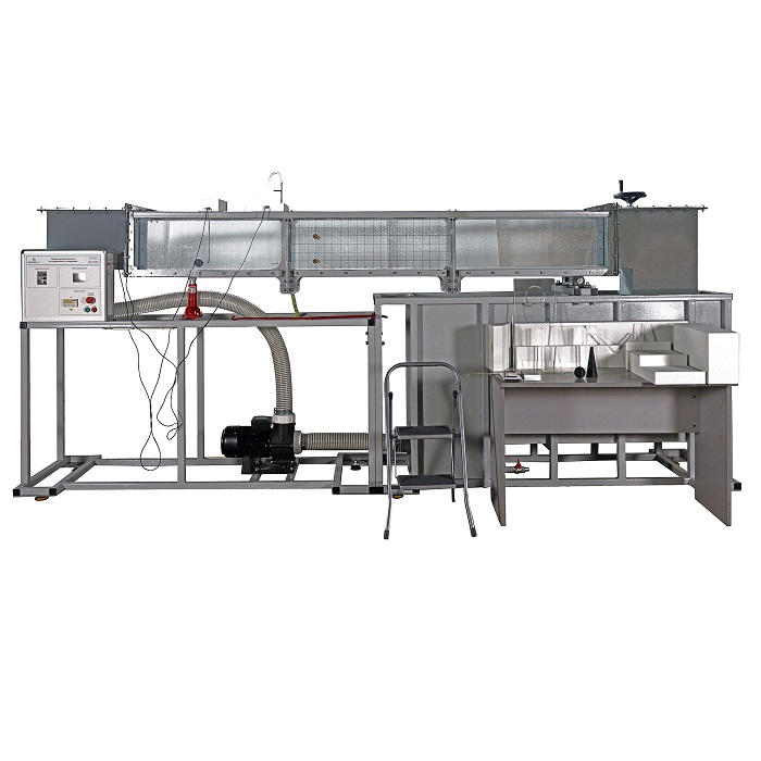 Проточная часть является основным элементам для проведения лабораторных работ. Проток представляет собой, сварную конструкцию из стали, с прозрачными вставками из акрилового материала, с механизмом качения и опорой для домкрата, также в конструкции имеются фланцы для присоединения напорного и сточного баков. В боковых частях протока, имеется механизм фиксации предназначенный для установки различных видов водосливов, разделителей и порогов. На выходе проточной части установлена механическая задвижка, изменение положения производятся при помощи рукоятки. Изменение угла наклона проточной части производится с помощью подъемного механизма. Измерение скорости потока осуществляется трубкой Пито.
