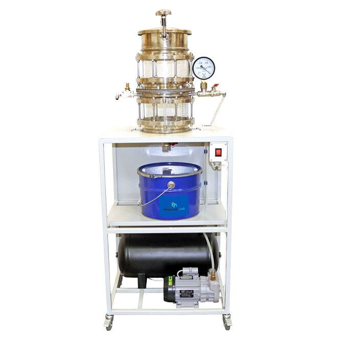 Стенд представляет собой рамное основание, выполненное из металлического профиля покрашенного порошковой краской. Основание имеет поворотные колесные опоры с тормозами. На рамном основании смонтирован вакуумный насос, способный создать разрежение, колба для фильтрации из прозрачного материала, состоящая из двух частей, соединение колбы осуществляется при помощи фланцевого соединения, в нижнюю часть колбы врезаны отводы для слива и подключения вакуумного насоса. Так же в нижней части имеется индикация уровня жидкости, между фланцевым соединением колбы устанавливается перфорированная решетка, фильтрующий элемент и резиновая прокладка, верхняя часть колбы имеет крышку.